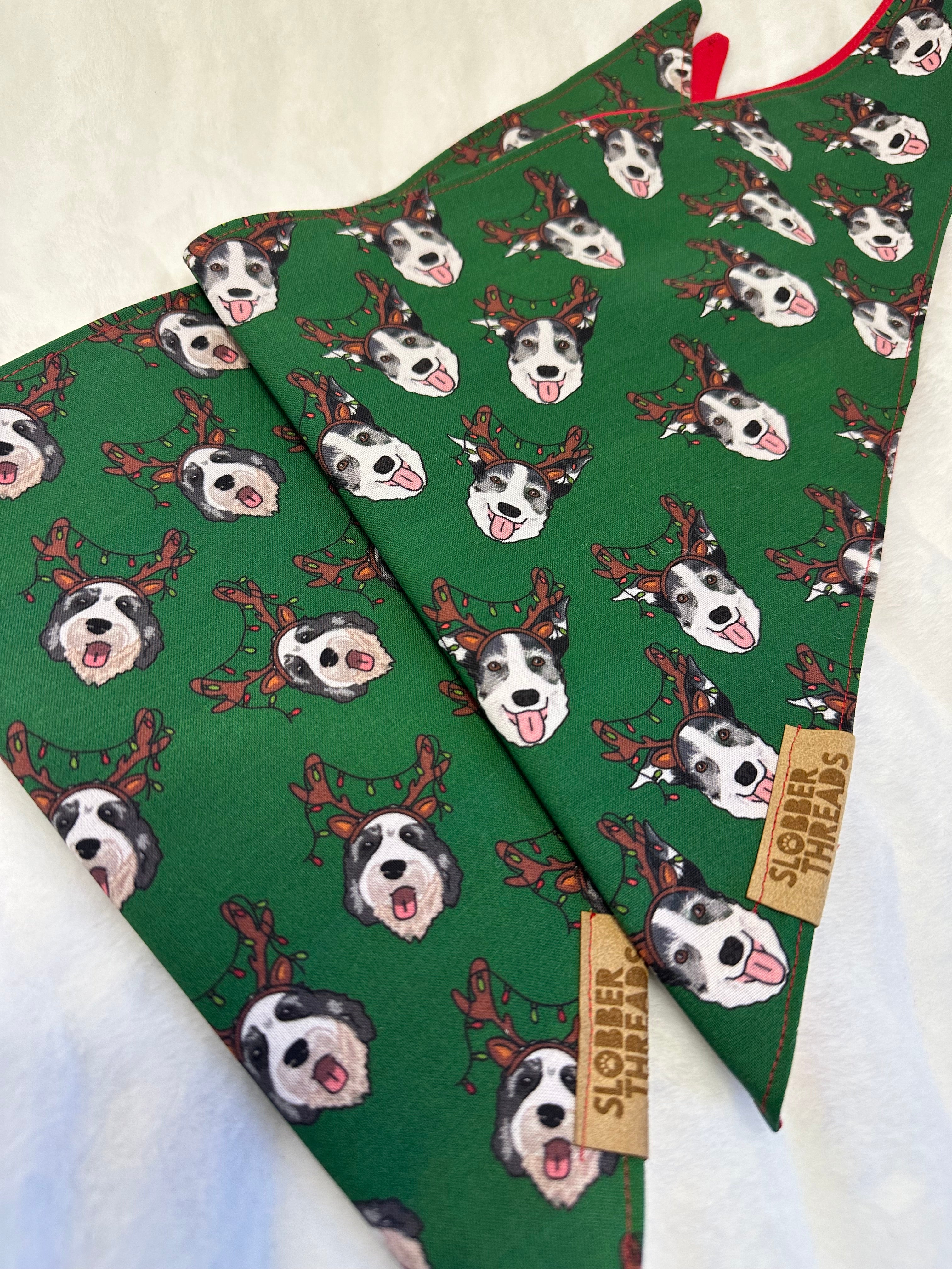Celebrate your pup this holiday season with a one-of-a-kind custom bandana! Choose between two festive designs — your dog tangled up in Christmas lights or wearing a playful reindeer hat.